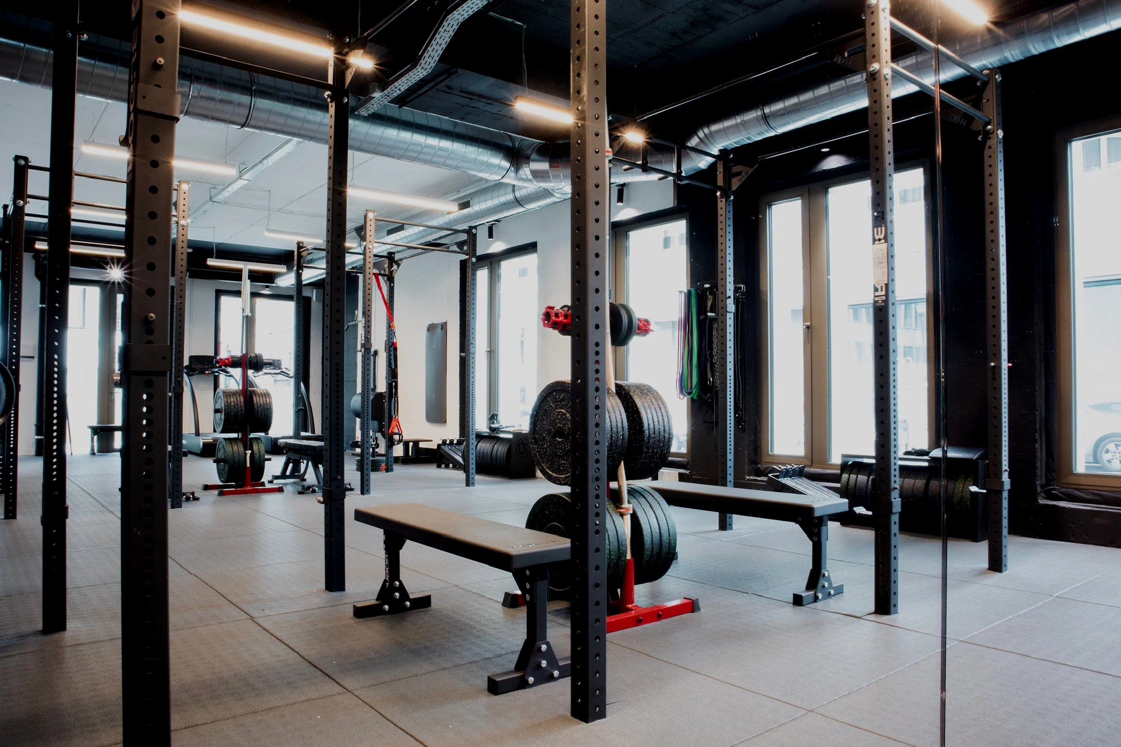 Empty gym with weightlifting benches, racks, and barbells. Industrial-style interior with exposed ducts and large windows.